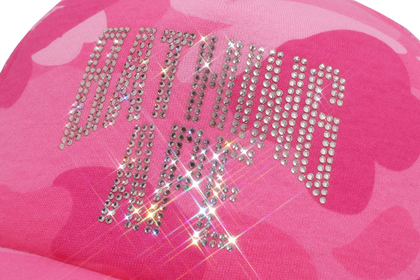 BAPE WOMENS COLOR CAMO CRYSTAL BATHING APE LOGO MESH CAP features dazzling rhinestones that catch the eye. Its breathable mesh fabric helps keep your head cool and comfortable, while the adjustable strap guarantees a customized, secure fit.
