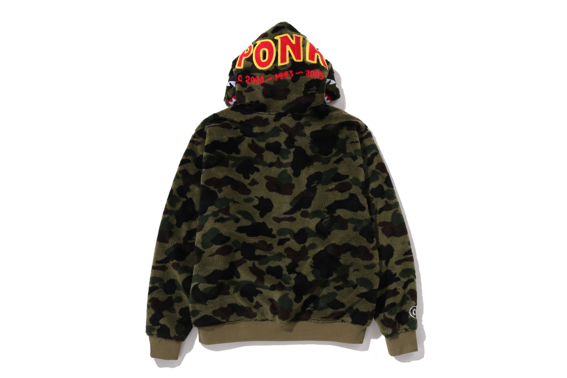Layer up with this iconic hybrid hoodie jacket that merges BAPE's signature camo aesthetic with a bold shark design. The plush boa delivers premium comfort and warmth, while the structured silhouette keeps you looking sharp. Perfect for making a statement whether you're heading out or settling in, this piece combines streetwear edge with cozy functionality.