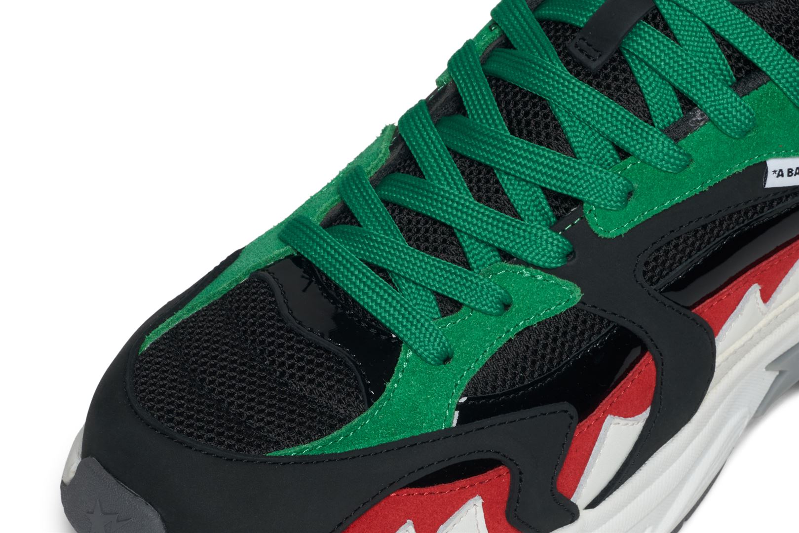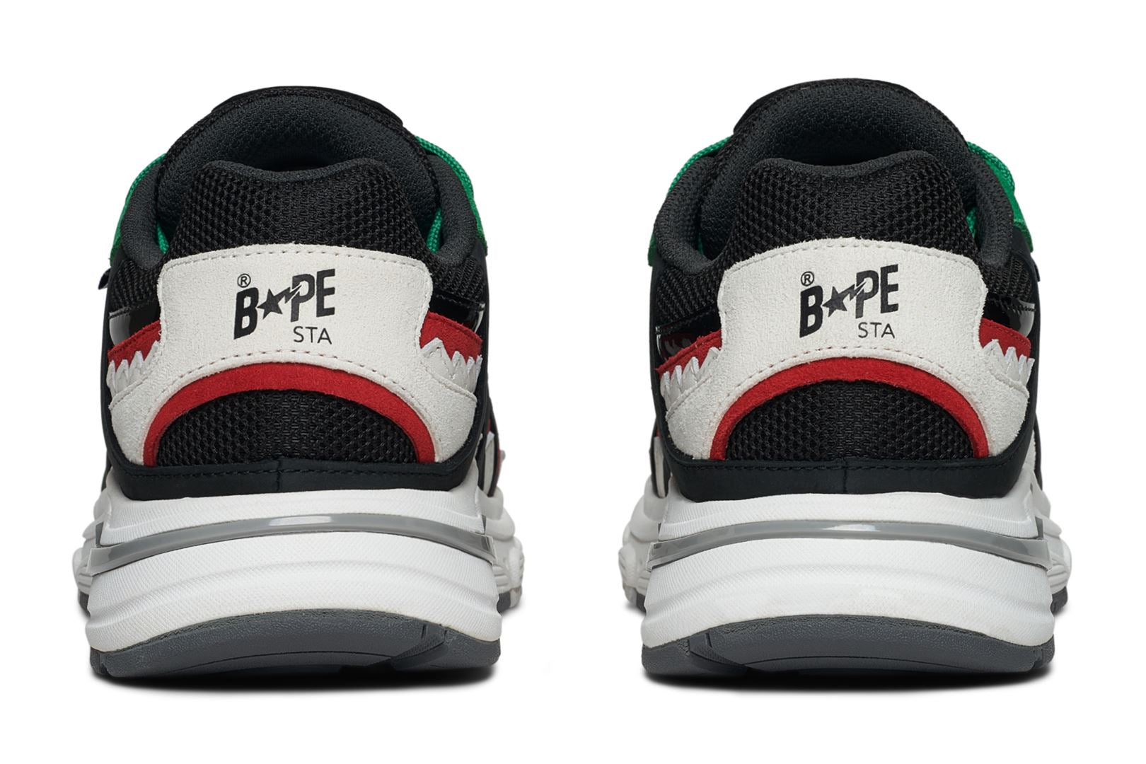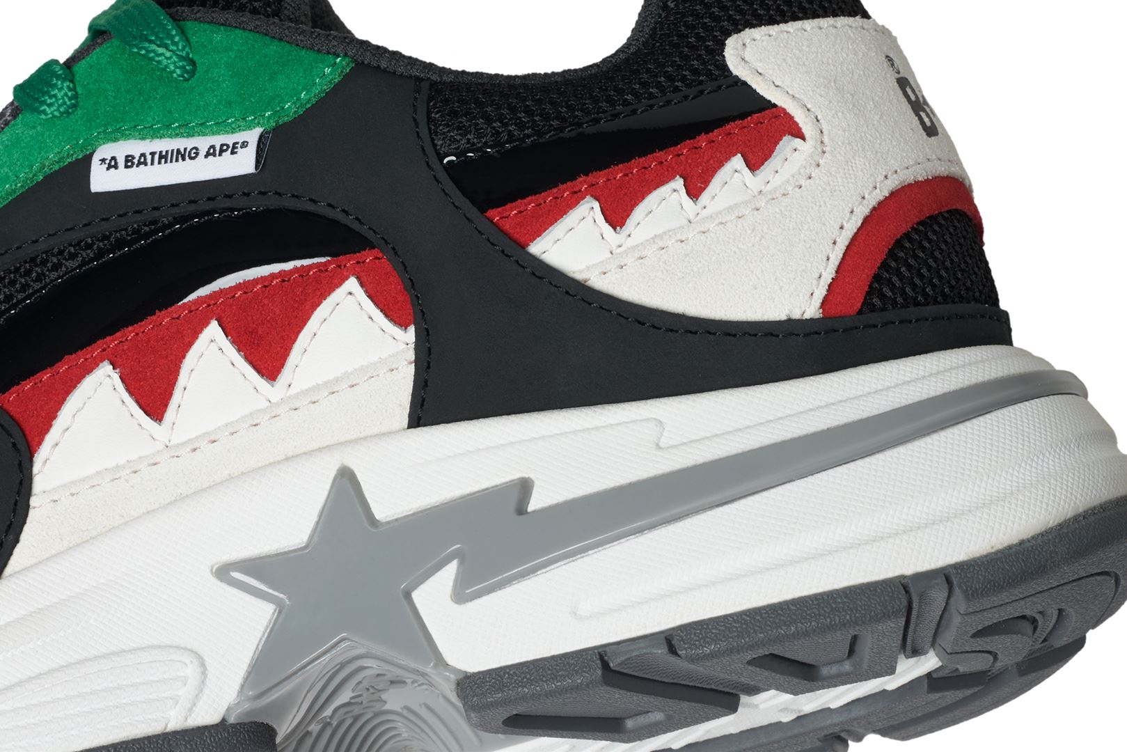 The SHARK STA was inspired by BAPE’s SHARK FULL ZIP HOODIE. It captures the essence of the original hoodie, translated into a footwear silhouette. Most notably, the SHARK STA draws inspiration from the shark face, which has been synonymous with BAPE® since its launch in 2004. Key details include the shark teeth overlay, a prominent midsole STA, gill-inspired branded arch and a chunky outer sole with a wave pattern.