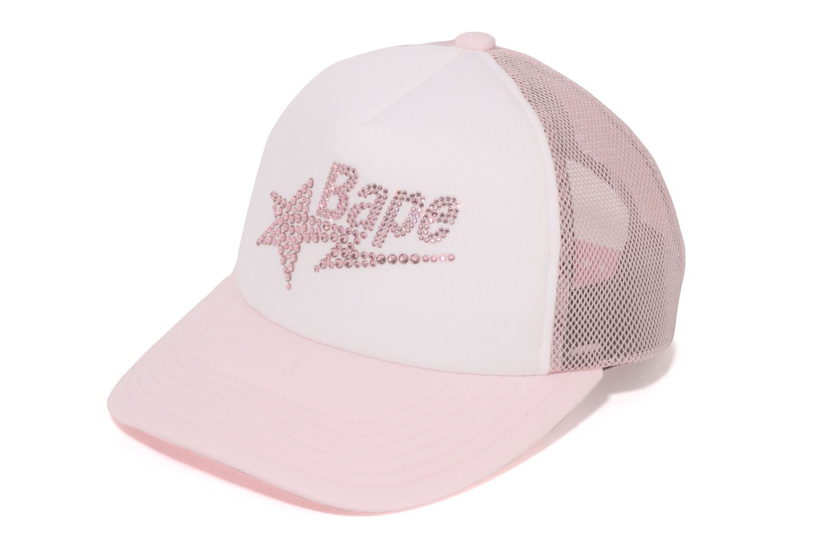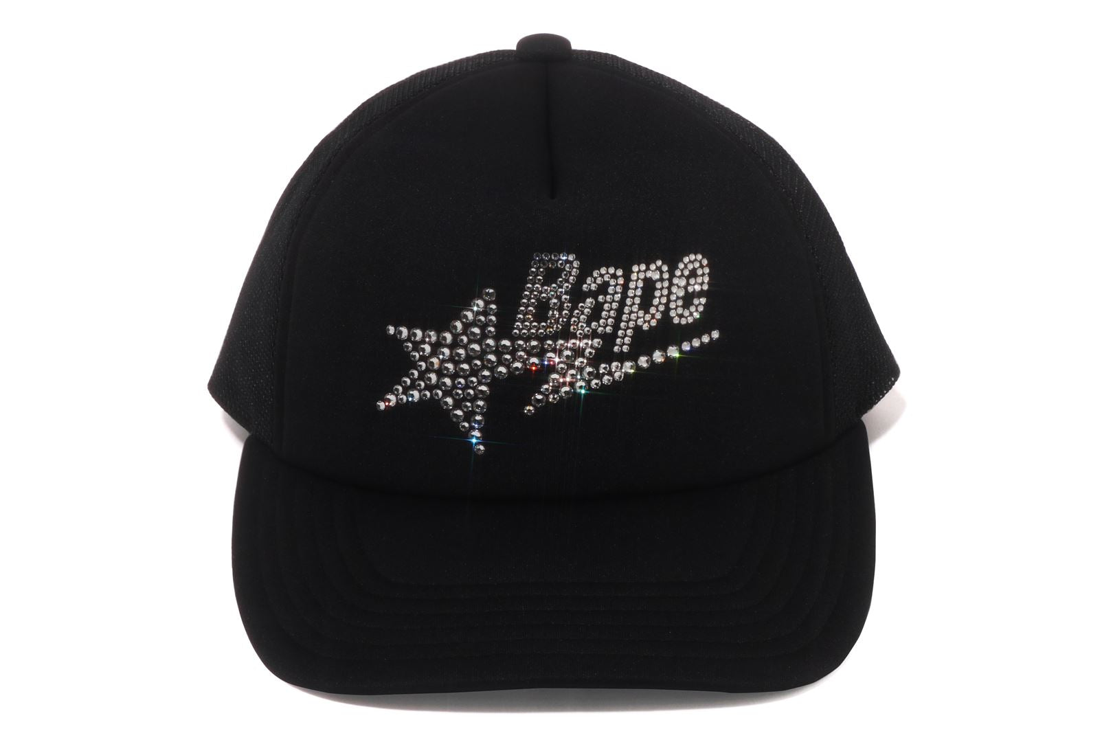 The CRYSTAL STONE BAPE STA LOGO MESH CAP features the iconic BAPE STA logo embellished with sparkling crystal stones, set on a breathable mesh base for comfort and style. A standout accessory that adds a touch of luxe to any outfit.