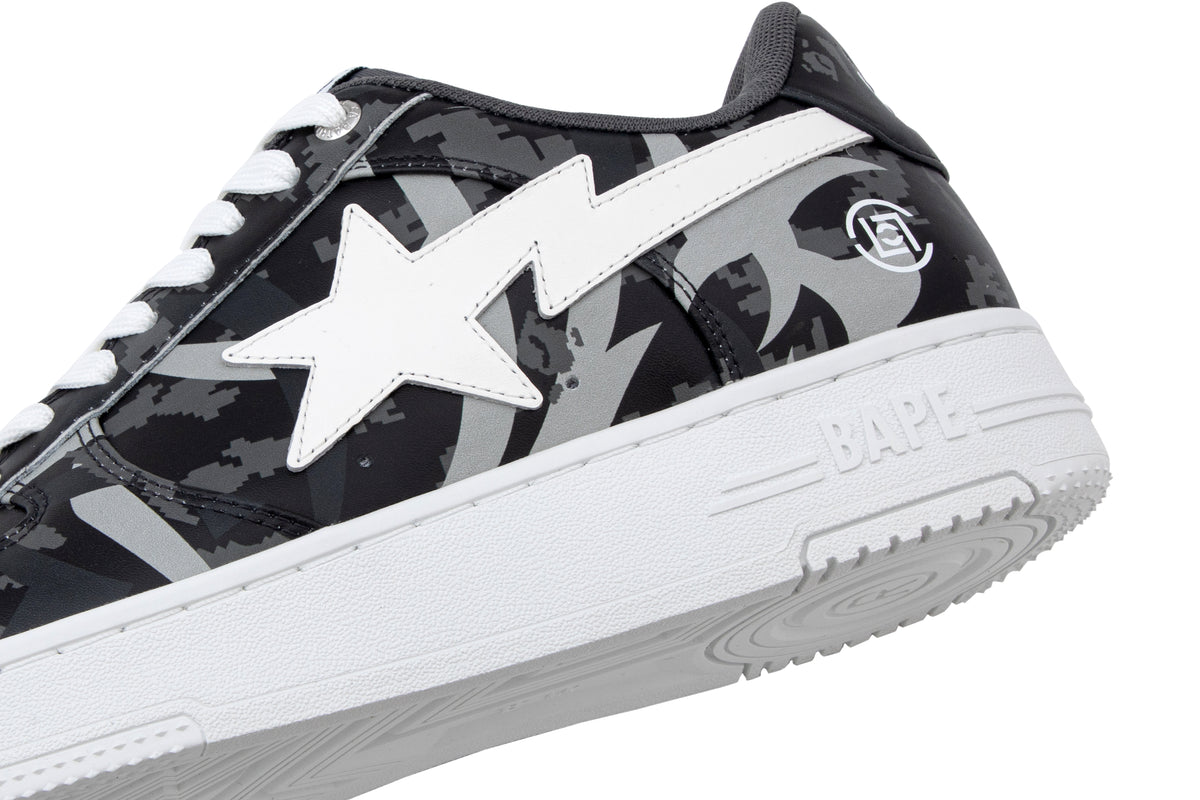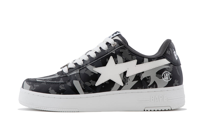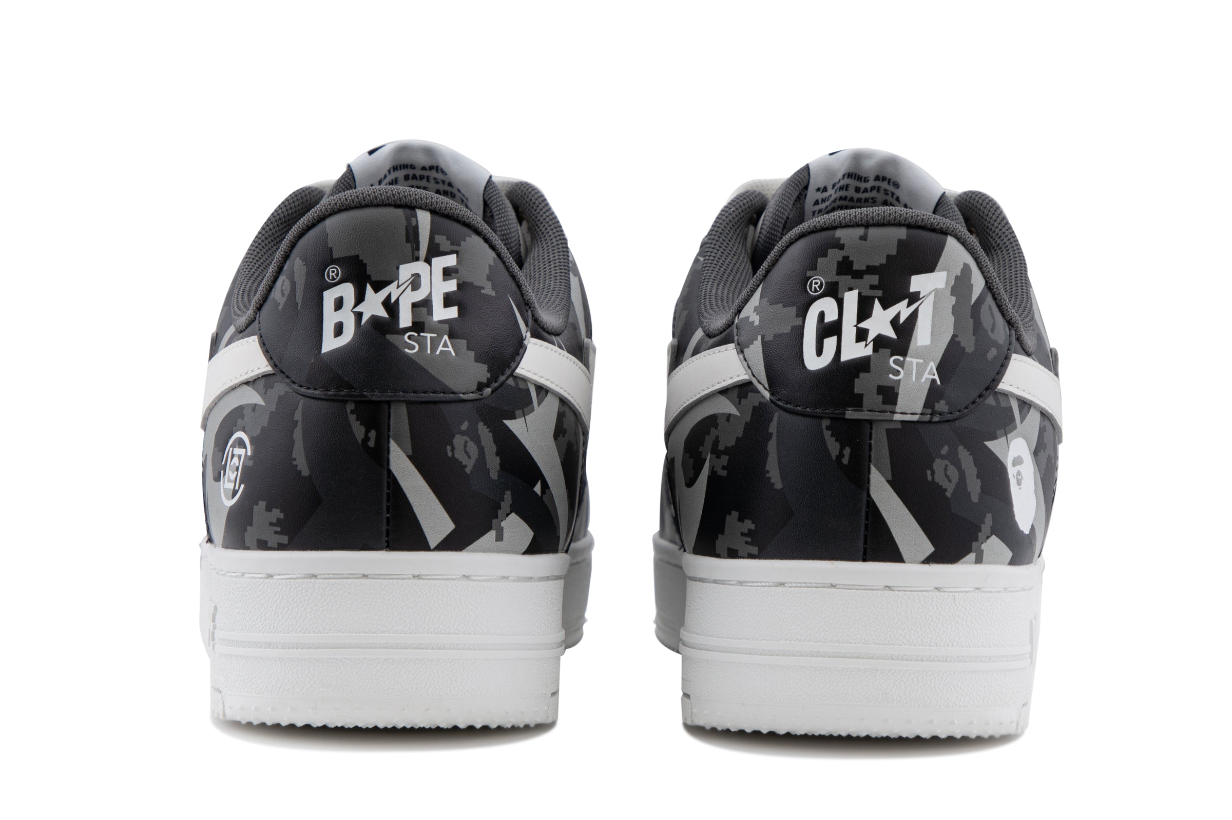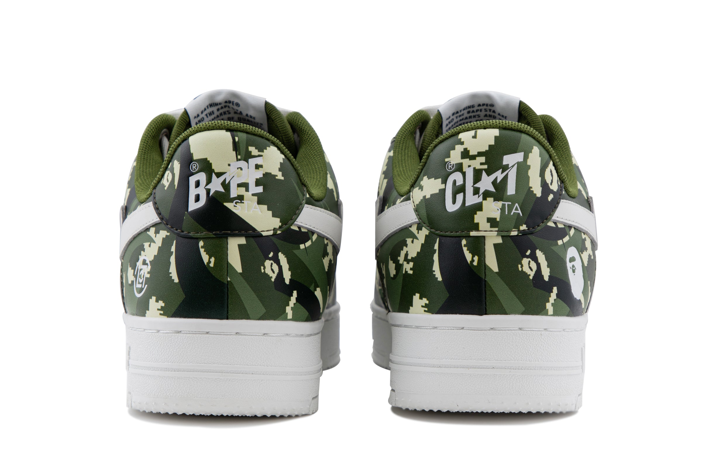The BAPE STA are reimagined with an all-over print of the collaborative camo pattern on the upper, complemented by a white STA logo. The lace tags feature BAPE Ape Head on the left shoe and the CLOT logo on the right, symbolizing the enduring partnership between the two brands.