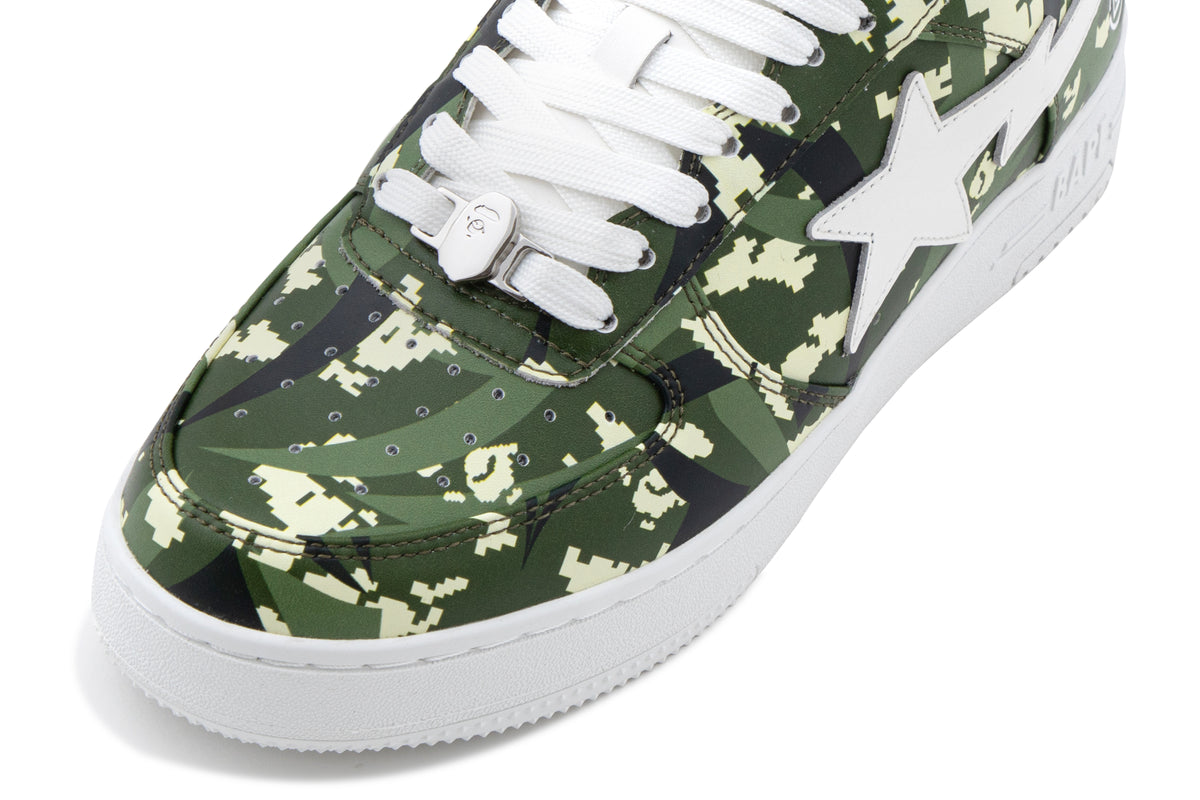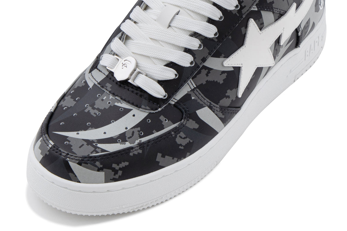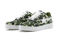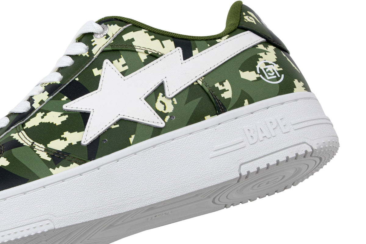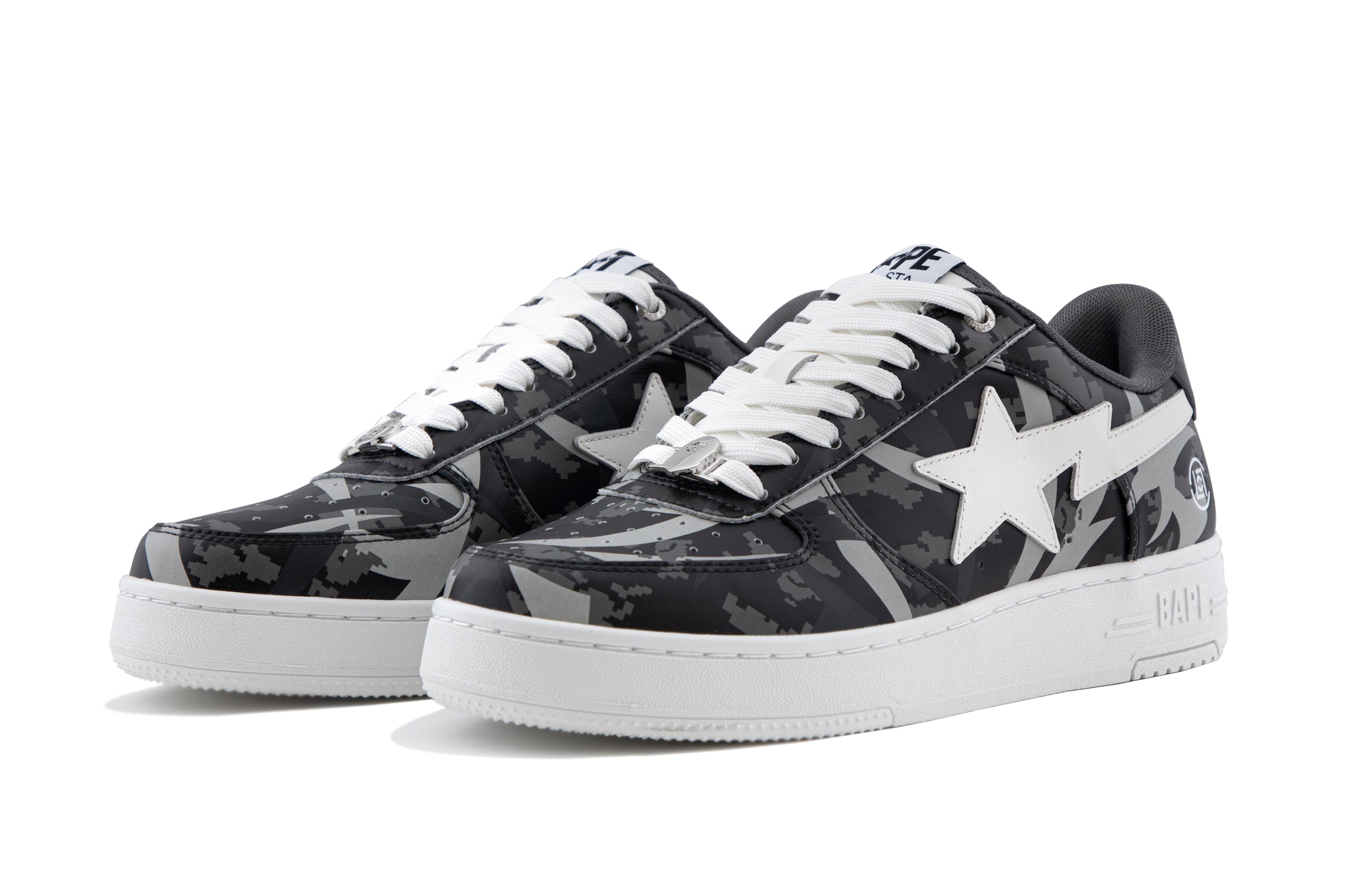 The BAPE STA are reimagined with an all-over print of the collaborative camo pattern on the upper, complemented by a white STA logo. The lace tags feature BAPE Ape Head on the left shoe and the CLOT logo on the right, symbolizing the enduring partnership between the two brands.